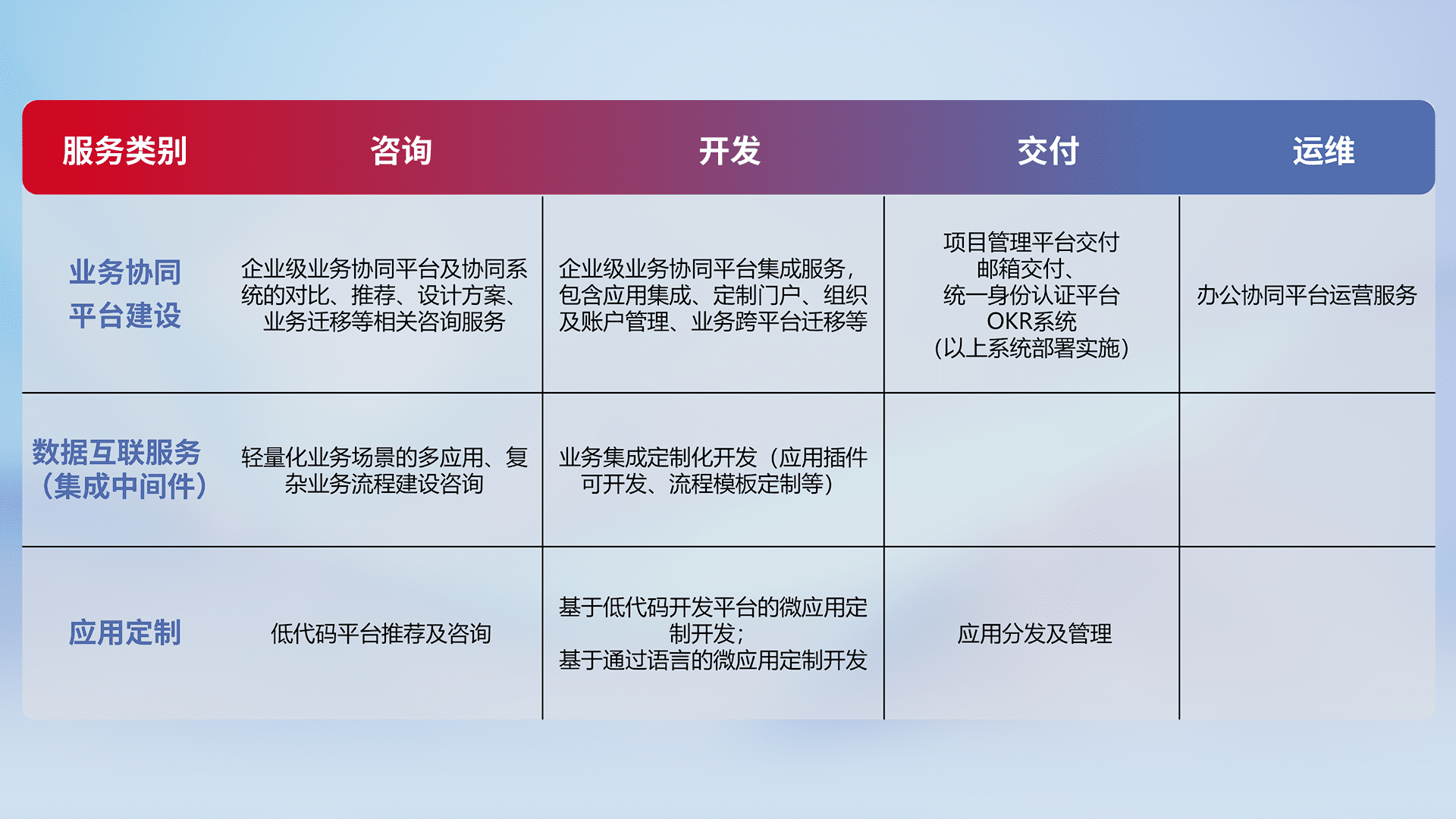 针对钉钉、、、企微、、、、IDaas等平台级产品提供产品的规划、、、、方案、、、、交付、、定制化开发等服务,,实现如统一协同办公、、、、智能客户服务、、、、混合会议管理、、智能数据查询、、、等业务场景,,,实现数字化转型。。